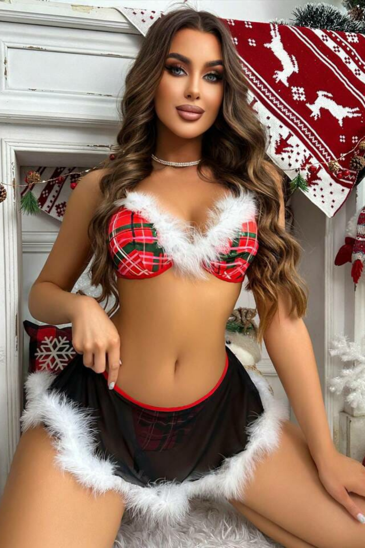 Bella Notte Kırmızı Siyah Tüy Detaylı Yılbaşı Tasarım Gecelik 16057